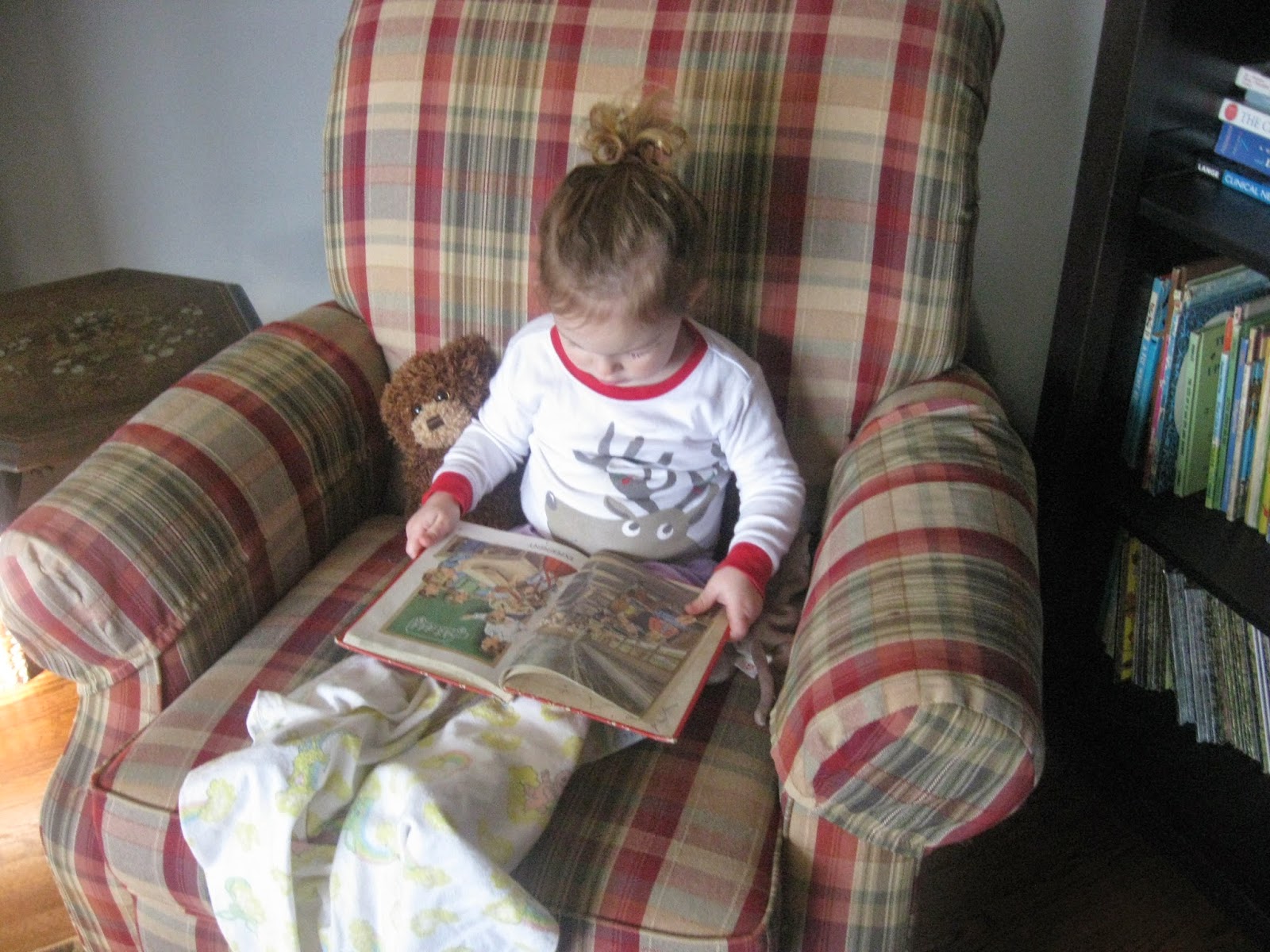 We're off to a bit of a rough start with some crying and screaming over wanting "Mommy's milk" and not wanting to go pee pee in the potty. This results in her peeing all over my lap. Thankfully Jim has not left for work yet and is able to help with the situation. She calms down, gets panties on for the day but refuses a new pair of pants, and snuggles up for a little morning milk. Winnie wakes up get a fresh diaper and starts her long nursing sessions while Riesling settles into a corner of her room with us and we read a dozen or more books including the new stack from our library visit yesterday. There are several that she really likes and requests repeat readings of. Jim was sweet enough to bring me a cup of coffee before he headed out for work so I catch a few sips between books.